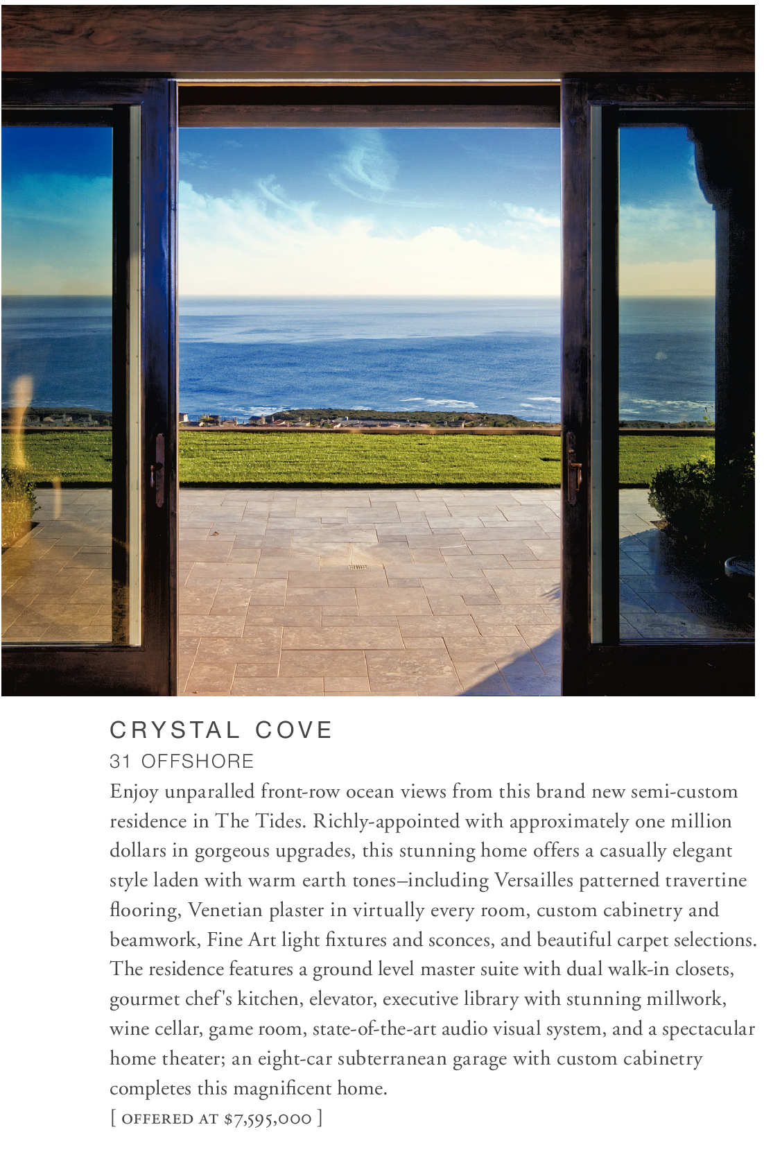 C RYS TA L C OV E 31 OFFSHORE Enjoy unparalled front-row ocean views from this brand new semi-custom residence in The Tides. Richly-appointed with approximately one million dollars in gorgeous upgrades, this stunning home offers a casually elegant style laden with warm earth tones–including Versailles patterned travertine flooring, Venetian plaster in virtually every room, custom cabinetry and beamwork, Fine Art light fixtures and sconces, and beautiful carpet selections. The residence features a ground level master suite with dual walk-in closets, gourmet chef's kitchen, elevator, executive library with stunning millwork, wine cellar, game room, state-of-the-art audio visual system, and a spectacular home theater; an eight-car subterranean garage with custom cabinetry completes this magnificent home. [ offered at $7,595,000 ] See also