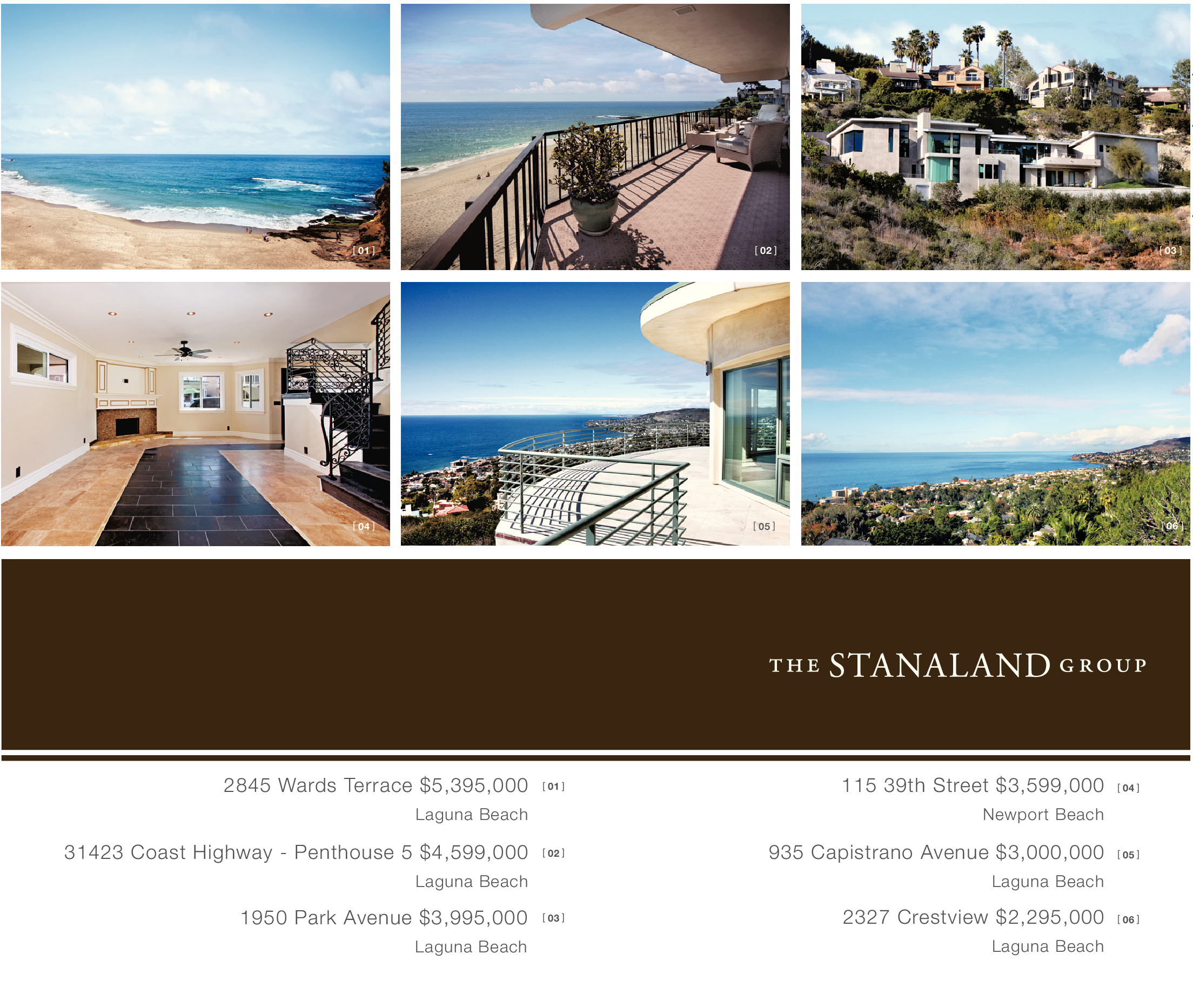 [ 01 ] [ 02 ] [ 04 ] [ 05 ] 2845 Wards Terrace $5,395,000 Laguna Beach 31423 Coast Highway - Penthouse 5 $4,599,000 Laguna Beach 1950 Park Avenue $3,995,000 Laguna Beach [ 01 ] [ 02 ] [ 03 ] 115 39th Street $3,599,000 Newport Beach 935 Capistrano Avenue $3,000,000 Laguna Beach 2327 Crestview $2,295,000 Laguna Beach [ 04 ] [ 05 ] [ 06 ] [ 03 ] [ 06 ]