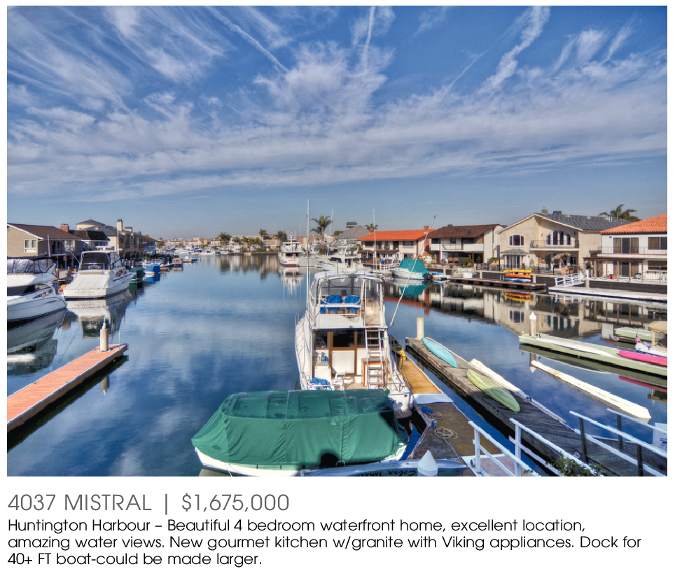 4037 MISTRAL | $1,675,000 Huntington Harbour – Beautiful 4 bedroom waterfront home, excellent location, amazing water views. New gourmet kitchen w/granite with Viking appliances. Dock for 40+ FT boat-could be made larger.