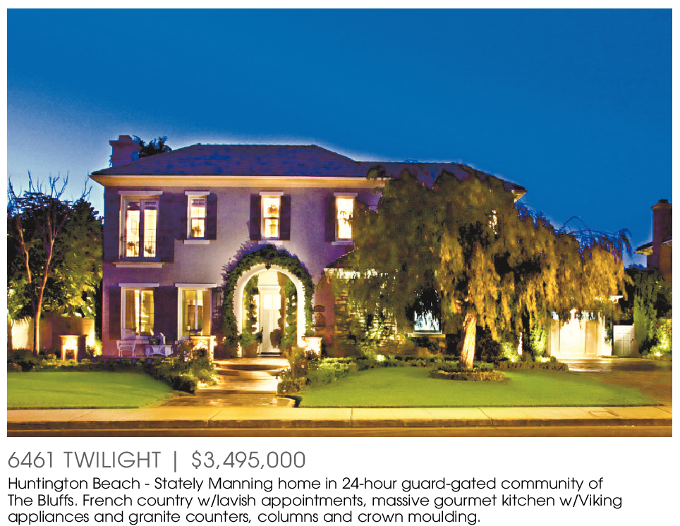 6461 TWILIGHT | $3,495,000 Huntington Beach - Stately Manning home in 24-hour guard-gated community of The Bluffs. French country w/lavish appointments, massive gourmet kitchen w/Viking appliances and granite counters, columns and crown moulding.