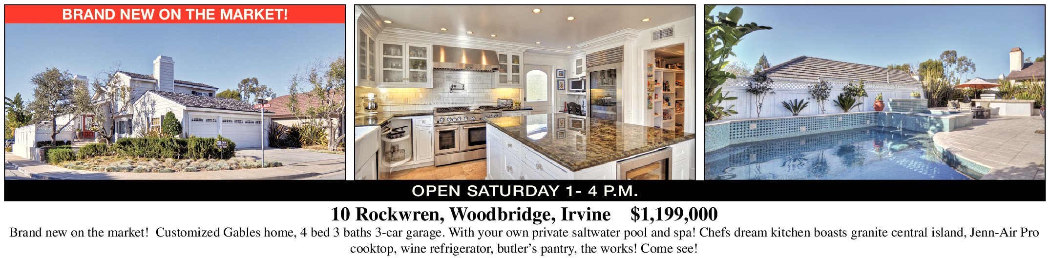 Brand new on the market! Customized Gables home, 4 bed 3 baths 3-car garage. With your own private saltwater pool and spa! Chefs dream kitchen boasts granite central island, Jenn-Air Pro cooktop, wine refrigerator, butler’s pantry, the works! Come see!