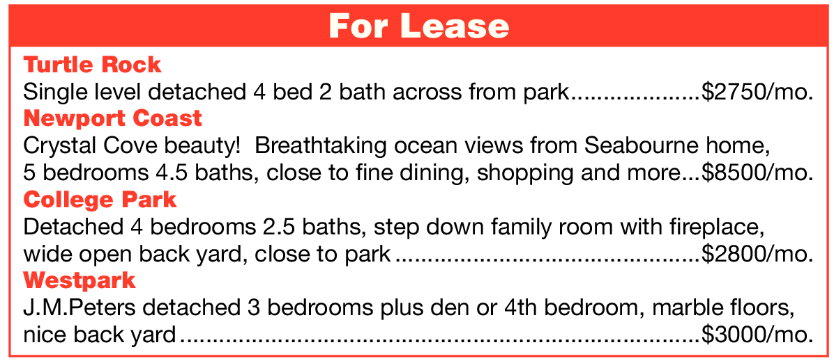 For Lease Turtle Rock Single level detached 4 bed 2 bath across from park ....................$2750/mo. Newport Coast Crystal Cove beauty! Breathtaking ocean views from Seabourne home, 5 bedrooms 4.5 baths, close to fine dining, shopping and more ...$8500/mo. College Park Detached 4 bedrooms 2.5 baths, step down family room with fireplace, wide open back yard, close to park ...............................................$2800/mo. Westpark J.M.Peters detached 3 bedrooms plus den or 4th bedroom, marble floors, nice back yard ................................................................................$3000/mo.