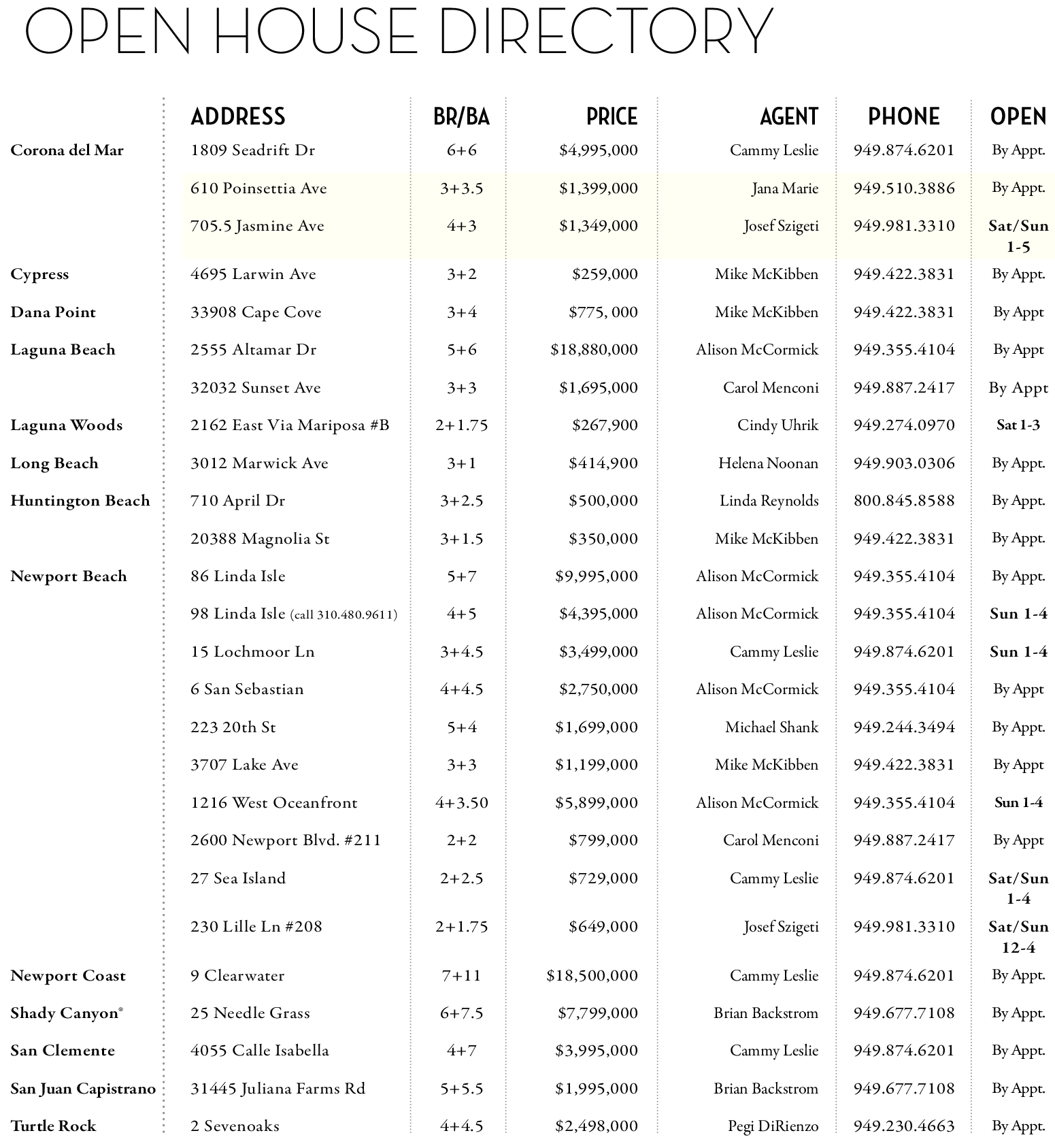 27 Sea Island 2+2.5 $729,000 Cammy Leslie 949.874.6201 Sat/Sun 1-4 230 Lille Ln #208 2+1.75 $649,000 Josef Szigeti 949.981.3310 Sat/Sun 12-4 Newport Coast 9 Clearwater 7+11 $18,500,000 Cammy Leslie 949.874.6201 By Appt.