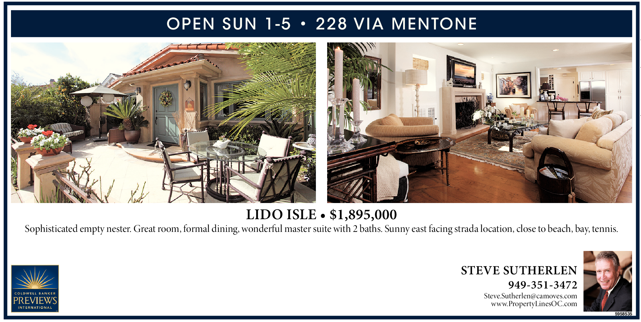 OPEN SUN 1-5 • 228 VIA MENTONE LIDO ISLE • $1,895,000 Sophisticated empty nester. Great room, formal dining, wonderful master suite with 2 baths. Sunny east facing strada location, close to beach, bay, tennis. STEVE SUTHERLEN 949-351-3472 Steve.Sutherlen@camoves.com www.PropertyLinesOC.com 5958535
