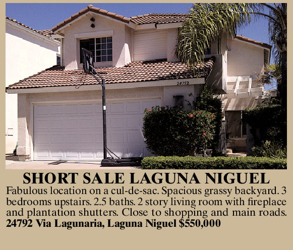 SHORT SALE LAGUNA NIGUEL Fabulous location on a cul-de-sac. Spacious grassy backyard. 3 bedrooms upstairs. 2.5 baths. 2 story living room with fireplace and plantation shutters. Close to shopping and main roads. 24792 Via Lagunaria, Laguna Niguel $550,000