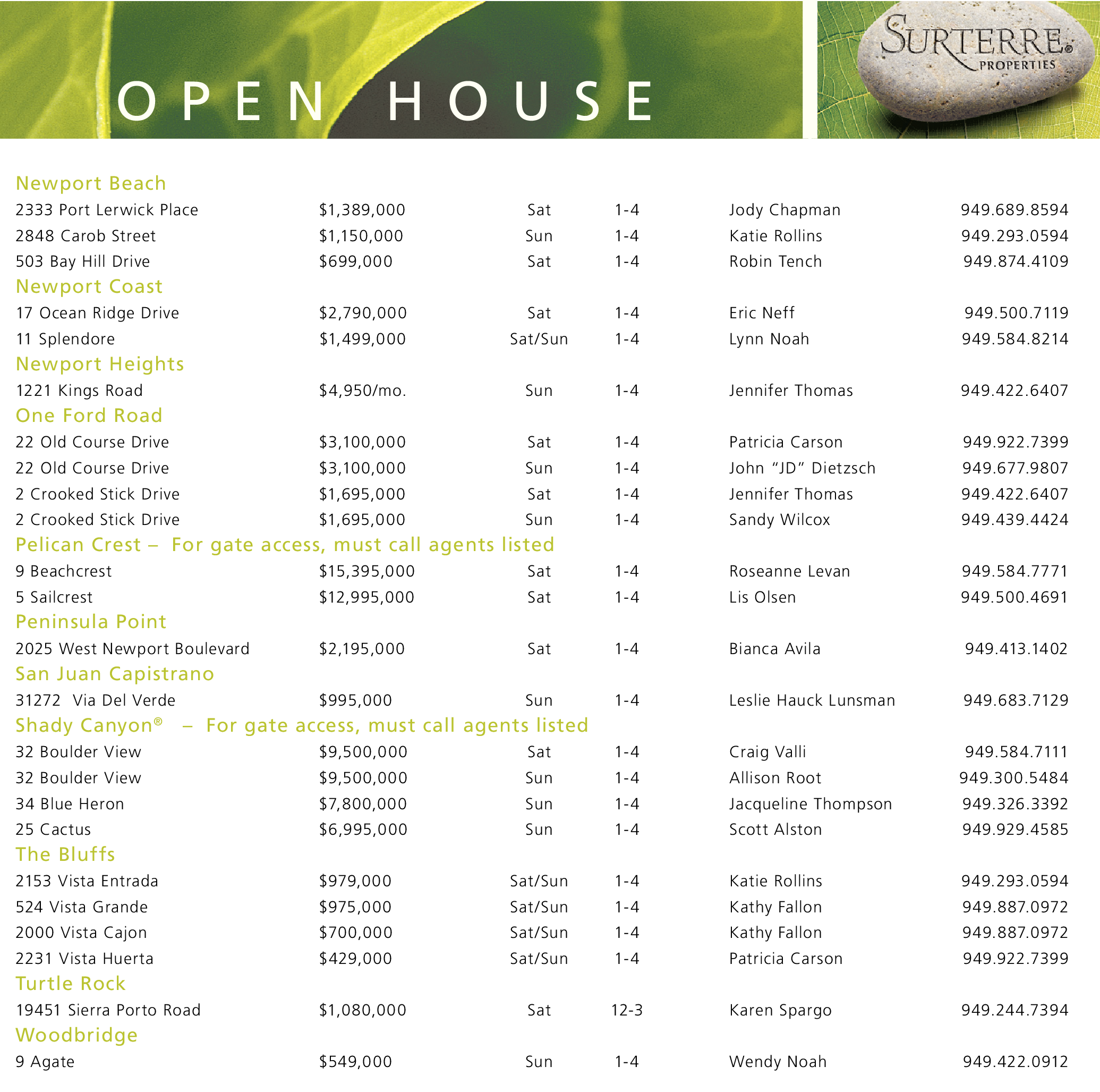 Newport Beach 2333 Port Lerwick Place $1,389,000 Sat 1-4 Jody Chapman 949.689.8594 2848 Carob Street $1,150,000 Sun 1-4 Katie Rollins 949.293.0594 503 Bay Hill Drive $699,000 Sat 1-4 Robin Tench 949.874.4109 Newport Coast 17 Ocean Ridge Drive $2,790,000 Sat 1-4 Eric Neff 949.500.7119 11 Splendore $1,499,000 Sat/Sun 1-4 Lynn Noah 949.584.8214 Newport Heights 1221 Kings Road $4,950/mo. Sun 1-4 Jennifer Thomas 949.422.6407 One Ford Road 22 Old Course Drive $3,100,000 Sat 1-4 Patricia Carson 949.922.7399 22 Old Course Drive $3,100,000 Sun 1-4 John “JD” Dietzsch 949.677.9807 2 Crooked Stick Drive $1,695,000 Sat 1-4 Jennifer Thomas 949.422.6407 2 Crooked Stick Drive $1,695,000 Sun 1-4 Sandy Wilcox 949.439.4424 Pelican Crest – For gate access, must call agents listed 9 Beachcrest $15,395,000 Sat 1-4 Roseanne Levan 949.584.7771 5 Sailcrest $12,995,000 Sat 1-4 Lis Olsen 949.500.4691 Peninsula Point 2025 West Newport Boulevard $2,195,000 Sat 1-4 Bianca Avila 949.413.1402 San Juan Capistrano 31272 Via Del Verde $995,000 Sun 1-4 Leslie Hauck Lunsman 949.683.7129 Shady Canyon ® – For gate access, must call agents listed 32 Boulder View $9,500,000 Sat 1-4 Craig Valli 949.584.7111 32 Boulder View $9,500,000 Sun 1-4 Allison Root 949.300.5484 34 Blue Heron $7,800,000 Sun 1-4 Jacqueline Thompson 949.326.3392 25 Cactus $6,995,000 Sun 1-4 Scott Alston 949.929.4585 The Bluffs 2153 Vista Entrada $979,000 Sat/Sun 1-4 Katie Rollins 949.293.0594 524 Vista Grande $975,000 Sat/Sun 1-4 Kathy Fallon 949.887.0972 2000 Vista Cajon $700,000 Sat/Sun 1-4 Kathy Fallon 949.887.0972 2231 Vista Huerta $429,000 Sat/Sun 1-4 Patricia Carson 949.922.7399 Turtle Rock 19451 Sierra Porto Road $1,080,000 Sat 12-3 Karen Spargo 949.244.7394 Woodbridge 9 Agate $549,000 Sun 1-4 Wendy Noah 949.422.0912