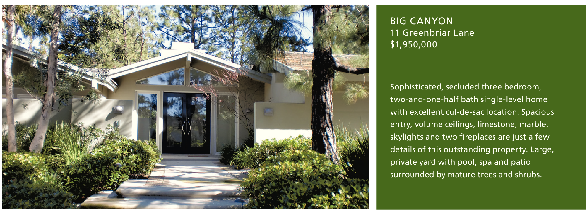 BIG CANYON 11 Greenbriar Lane $1,950,000 Sophisticated, secluded three bedroom, two-and-one-half bath single-level home with excellent cul-de-sac location. Spacious entry, volume ceilings, limestone, marble, skylights and two fireplaces are just a few details of this outstanding property. Large, private yard with pool, spa and patio surrounded by mature trees and shrubs.