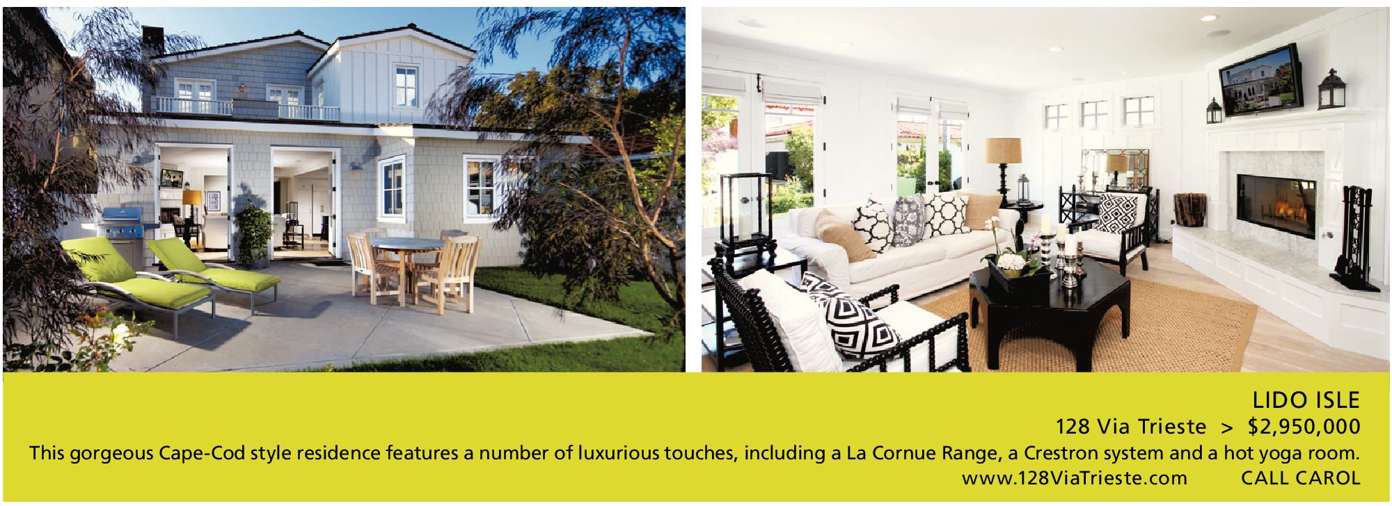 LIDO ISLE 128 Via Trieste > $2,950,000 This gorgeous Cape-Cod style residence features a number of luxurious touches, including a La Cornue Range, a Crestron system and a hot yoga room.