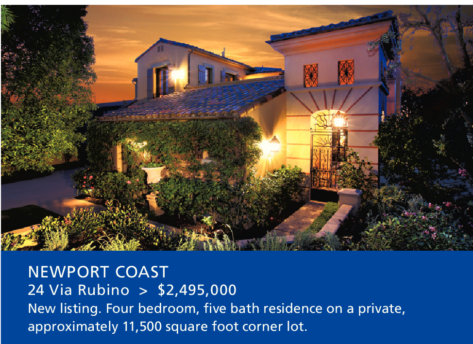 NEWPORT COAST 24 Via Rubino > $2,495,000 New listing. Four bedroom, five bath residence on a private, approximately 11,500 square foot corner lot.