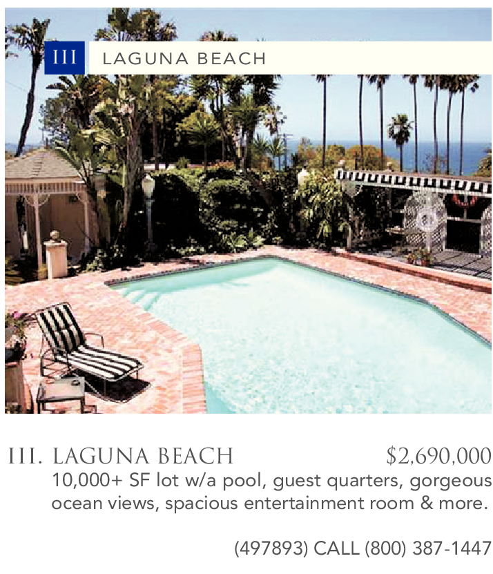 LAGUNA BEACH $2,690,000 10,000+ SF lot w/a pool, guest quarters, gorgeous ocean views, spacious entertainment room & more.