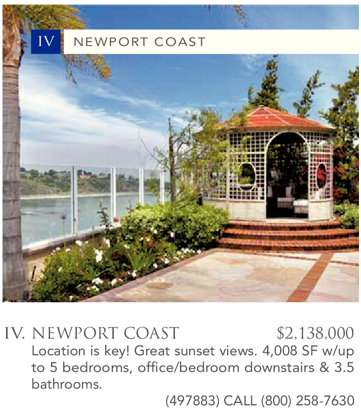 IV. NEWPORT COAST $2,138,000 Location is key! Great sunset views. 4,008 SF w/up to 5 bedrooms, office/bedroom downstairs & 3.5 bathrooms.