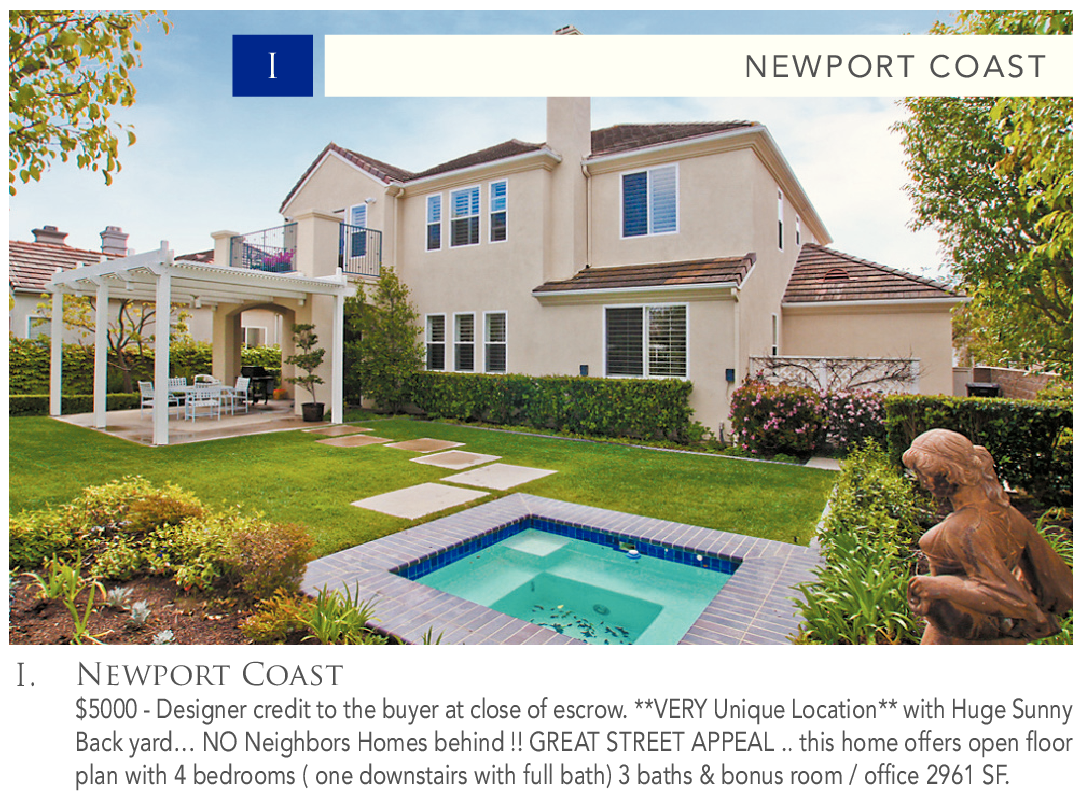 I NEWPORT COAST I . Newport Coast $5000 - Designer credit to the buyer at close of escrow. **VERY Unique Location** with Huge Sunny Back yard… NO Neighbors Homes behind !! GREAT STREET APPEAL .. this home offers open floor plan with 4 bedrooms ( one downstairs with full bath) 3 baths & bonus room / office 2961 SF. See also