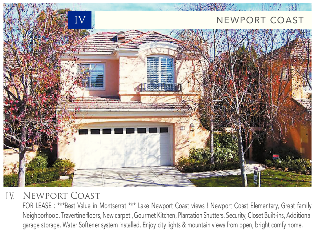I V. Newport Coast FOR LEASE : ***Best Value in Montserrat *** Lake Newport Coast views ! Newport Coast Elementary, Great family Neighborhood. Travertine floors, New carpet , Gourmet Kitchen, Plantation Shutters, Security, Closet Built-ins, Additional garage storage. Water Softener system installed. Enjoy city lights & mountain views from open, bright comfy home.