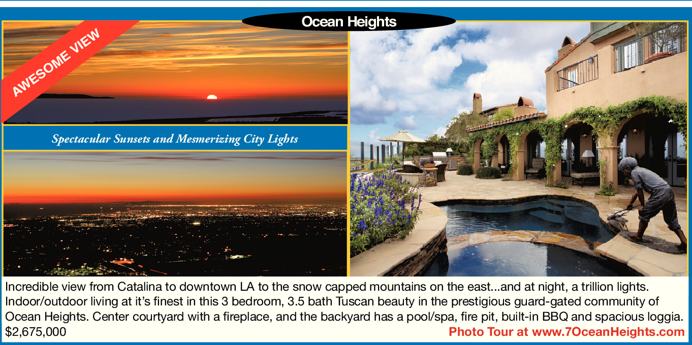 Spectacular Sunsets and Mesmerizing City Lights Ocean Heights Incredible view from Catalina to downtown LA to the snow capped mountains on the east...and at night, a trillion lights. Indoor/outdoor living at it’s finest in this 3 bedroom, 3.5 bath Tuscan beauty in the prestigious guard-gated community of Ocean Heights. Center courtyard with a fireplace, and the backyard has a pool/spa, fire pit, built-in BBQ and spacious loggia. $2,675,000 Photo Tour at www.7OceanHeights.com