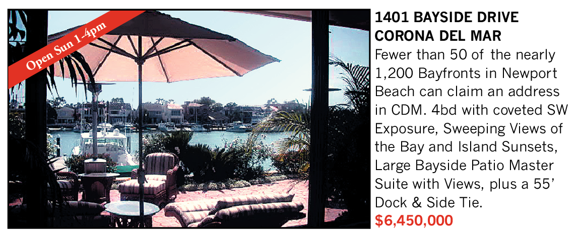 1401 BAYSIDE DRIVE CORONA DEL MAR Fewer than 50 of the nearly 1,200 Bayfronts in Newport Beach can claim an address in CDM. 4bd with coveted SW Exposure, Sweeping Views of the Bay and Island Sunsets, Large Bayside Patio Master Suite with Views, plus a 55’ Dock & Side Tie. $6,450,000