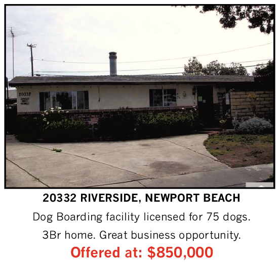 20332 RIVERSIDE, NEWPORT BEACH Dog Boarding facility licensed for 75 dogs.