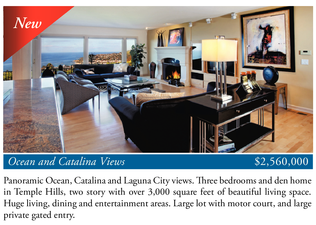 New Ocean and Catalina Views $2,560,000 Panoramic Ocean, Catalina and Laguna City views. Three bedrooms and den home in Temple Hills, two story with over 3,000 square feet of beautiful living space. Huge living, dining and entertainment areas. Large lot with motor court, and large private gated entry.