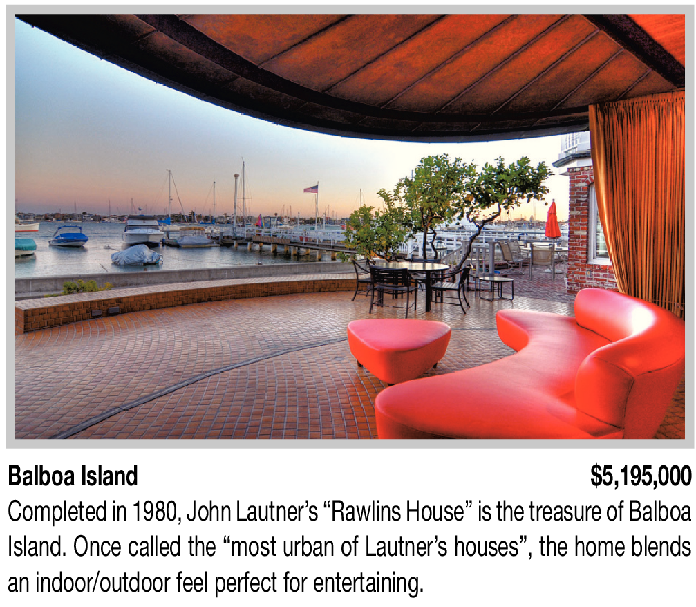 Balboa Island $5,195,000 Completed in 1980, John Lautner’s “Rawlins House” is the treasure of Balboa Island. Once called the “most urban of Lautner’s houses”, the home blends an indoor/outdoor feel perfect for entertaining.
