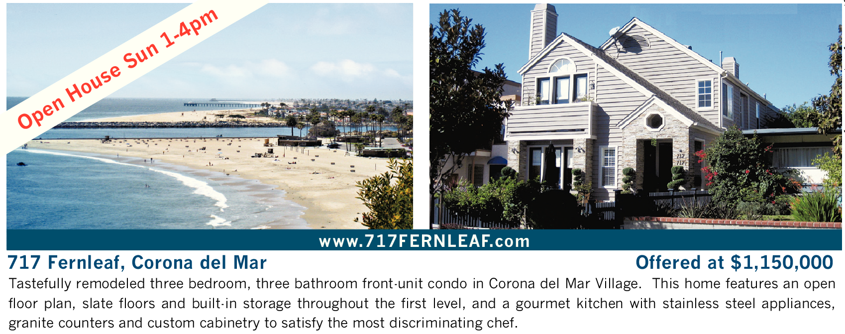 www.717FERNLEAF.com 717 Fernleaf, Corona del Mar Offered at $1,150,000 Tastefully remodeled three bedroom, three bathroom front-unit condo in Corona del Mar Village. This home features an open floor plan, slate floors and built-in storage throughout the first level, and a gourmet kitchen with stainless steel appliances, granite counters and custom cabinetry to satisfy the most discriminating chef.
