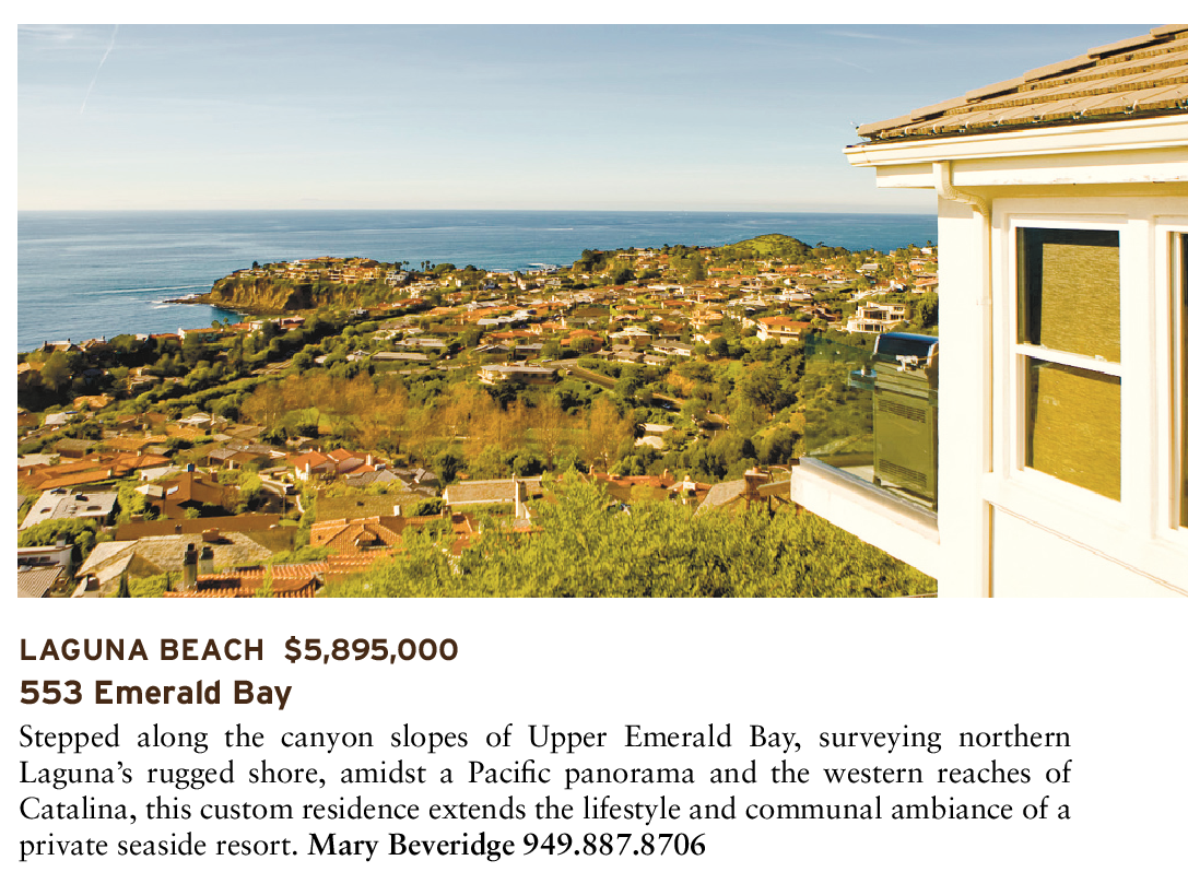 LAGUNA BEACH $5,895,000 553 Emerald Bay Stepped along the canyon slopes of Upper Emerald Bay, surveying northern Laguna’s rugged shore, amidst a Pacific panorama and the western reaches of Catalina, this custom residence extends the lifestyle and communal ambiance of a private seaside resort. Mary Beveridge 949.887.8706