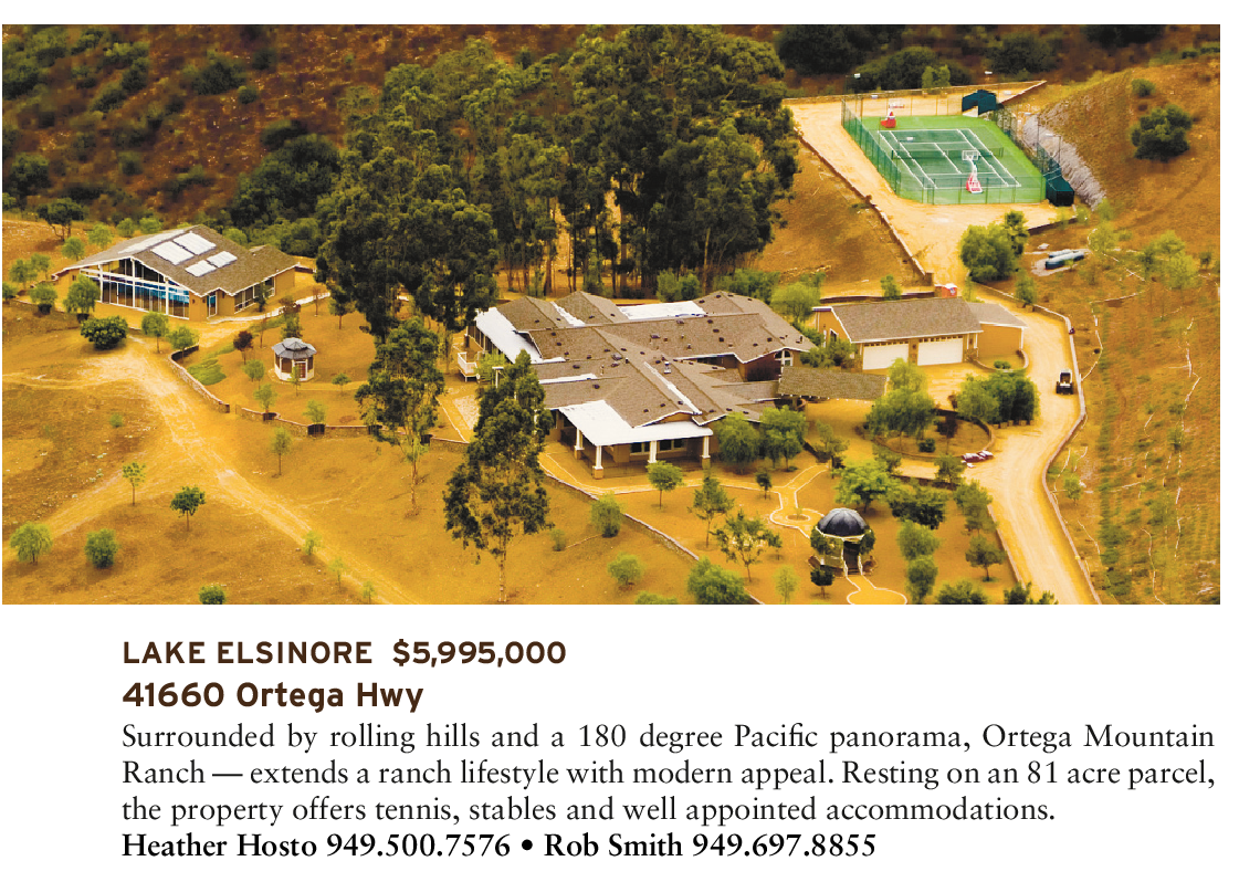 LAKE ELSINORE $5,995,000 41660 Ortega Hwy Surrounded by rolling hills and a 180 degree Pacific panorama, Ortega Mountain Ranch — extends a ranch lifestyle with modern appeal. Resting on an 81 acre parcel, the property offers tennis, stables and well appointed accommodations. Heather Hosto 949.500.7576 • Rob Smith 949.697.8855