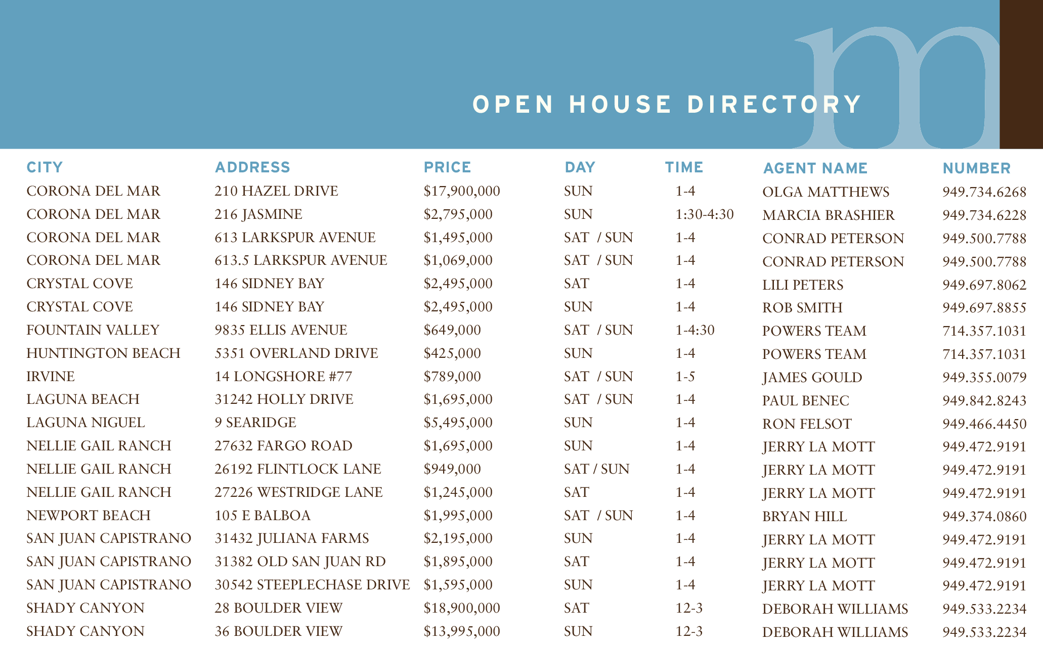 AGENT NAME OLGA MATTHEWS MARCIA BRASHIER CONRAD PETERSON CONRAD PETERSON LILI PETERS ROB SMITH POWERS TEAM POWERS TEAM JAMES GOULD PAUL BENEC RON FELSOT JERRY LA MOTT JERRY LA MOTT JERRY LA MOTT BRYAN HILL JERRY LA MOTT JERRY LA MOTT JERRY LA MOTT DEBORAH WILLIAMS DEBORAH WILLIAMS