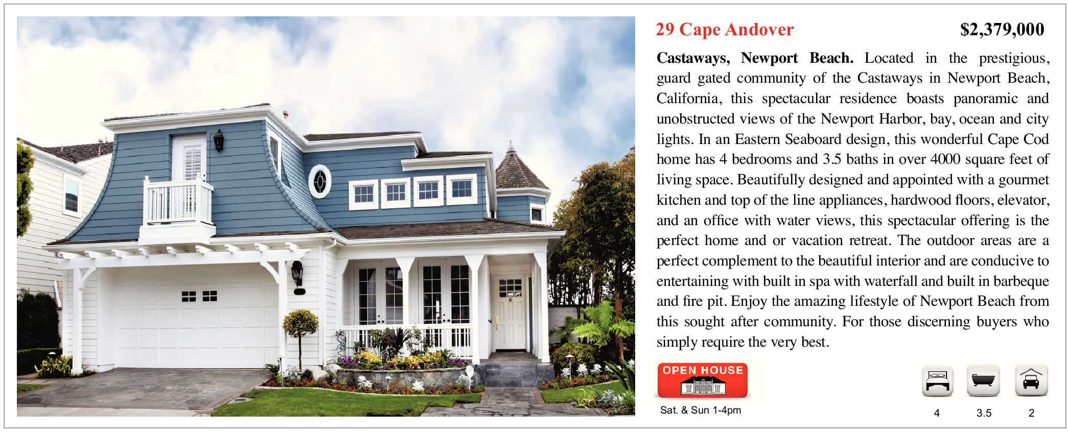 Castaways, Newport Beach. Located in the prestigious, guard gated community of the Castaways in Newport Beach, California, this spectacular residence boasts panoramic and unobstructed views of the Newport Harbor, bay, ocean and city lights. In an Eastern Seaboard design, this wonderful Cape Cod home has 4 bedrooms and 3.5 baths in over 4000 square feet of living space. Beautifully designed and appointed with a gourmet kitchen and top of the line appliances, hardwood floors, elevator, and an office with water views, this spectacular offering is the perfect home and or vacation retreat. The outdoor areas are a perfect complement to the beautiful interior and are conducive to entertaining with built in spa with waterfall and built in barbeque and fire pit. Enjoy the amazing lifestyle of Newport Beach from this sought after community. For those discerning buyers who simply require the very best.
