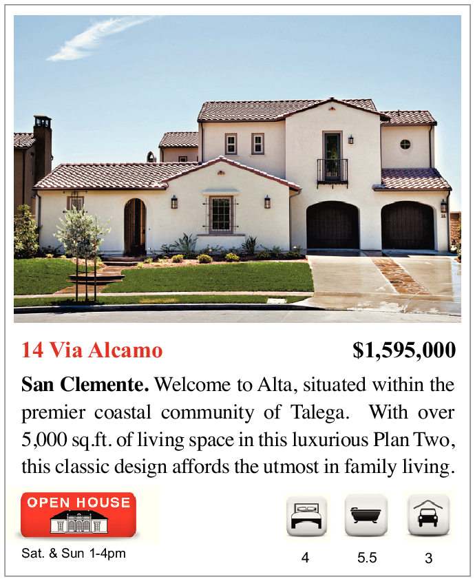 14 Via Alcamo $1,595,000 San Clemente. Welcome to Alta, situated within the premier coastal community of Talega. With over 5,000 sq.ft. of living space in this luxurious Plan Two, this classic design affords the utmost in family living. Sat. & Sun 1-4pm 4 5.5 3