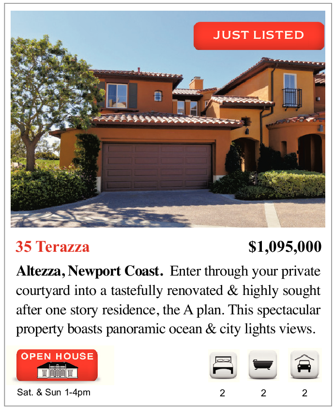 Altezza, Newport Coast. Enter through your private courtyard into a tastefully renovated & highly sought after one story residence, the A plan. This spectacular property boasts panoramic ocean & city lights views.