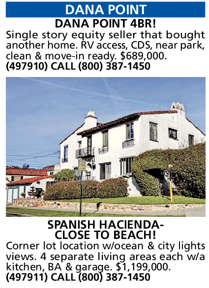 DANA POINT DANA POINT 4BR! Single story equity seller that bought another home. RV access, CDS, near park, clean & move-in ready. $689,000. (497910) CALL (800) 387-1450 SPANISH HACIENDA- CLOSE TO BEACH! Corner lot location w/ocean & city lights views. 4 separate living areas each w/a kitchen, BA & garage. $1,199,000. (497911) CALL (800) 387-1450