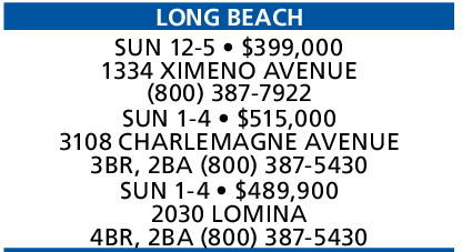 LONG BEACH SUN 12-5 • $399,000 1334 XIMENO AVENUE (800) 387-7922 SUN 1-4 • $515,000 3108 CHARLEMAGNE AVENUE 3BR, 2BA (800) 387-5430 SUN 1-4 • $489,900 2030 LOMINA 4BR, 2BA (800) 387-5430