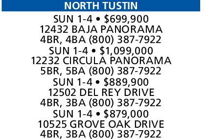 NORTH TUSTIN SUN 1-4 • $699,900 12432 BAJA PANORAMA 4BR, 4BA (800) 387-7922 SUN 1-4 • $1,099,000 12232 CIRCULA PANORAMA 5BR, 5BA (800) 387-7922 SUN 1-4 • $889,900 12502 DEL REY DRIVE 4BR, 3BA (800) 387-7922 SUN 1-4 • $879,000 10525 GROVE OAK DRIVE 4BR, 3BA (800) 387-7922