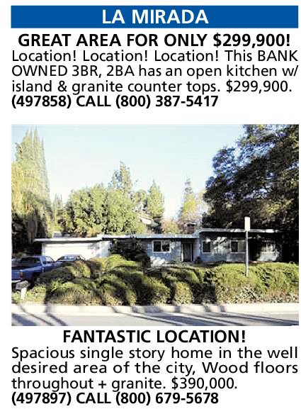 LA MIRADA GREAT AREA FOR ONLY $299,900! Location! Location! Location! This BANK OWNED 3BR, 2BA has an open kitchen w/ island & granite counter tops. $299,900. (497858) CALL (800) 387-5417 FANTASTIC LOCATION! Spacious single story home in the well desired area of the city, Wood floors throughout + granite. $390,000. (497897) CALL (800) 679-5678