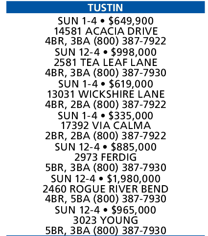 TUSTIN SUN 1-4 • $649,900 14581 ACACIA DRIVE 4BR, 3BA (800) 387-7922 SUN 12-4 • $998,000 2581 TEA LEAF LANE 4BR, 3BA (800) 387-7930 SUN 1-4 • $619,000 13031 WICKSHIRE LANE 4BR, 2BA (800) 387-7922 SUN 1-4 • $335,000 17392 VIA CALMA 2BR, 2BA (800) 387-7922 SUN 12-4 • $885,000 2973 FERDIG 5BR, 3BA (800) 387-7930 SUN 12-4 • $1,980,000 2460 ROGUE RIVER BEND 4BR, 5BA (800) 387-7930 SUN 12-4 • $965,000 3023 YOUNG 5BR, 3BA (800) 387-7930
