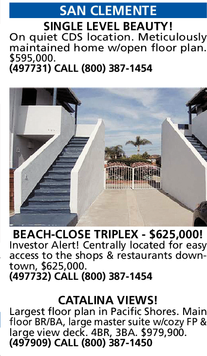 ceilings w/granite w/marble w/ yard double SAN CLEMENTE SINGLE LEVEL BEAUTY! On quiet CDS location. Meticulously maintained home w/open floor plan. $595,000. (497731) CALL (800) 387-1454 BEACH-CLOSE TRIPLEX - $625,000! Investor Alert! Centrally located for easy access to the shops & restaurants downtown, $625,000. (497732) CALL (800) 387-1454 CATALINA VIEWS! Largest floor plan in Pacific Shores. Main floor BR/BA, large master suite w/cozy FP & large view deck. 4BR, 3BA. $979,900. (497909) CALL (800) 387-1450