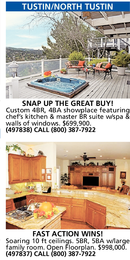 w/separate w/ w/ master TUSTIN/NORTH TUSTIN SNAP UP THE GREAT BUY! Custom 4BR, 4BA showplace featuring chef’s kitchen & master BR suite w/spa & walls of windows. $699,900. (497838) CALL (800) 387-7922 FAST ACTION WINS! Soaring 10 ft ceilings. 5BR, 5BA w/large family room. Open Floorplan. $998,000. (497837) CALL (800) 387-7922