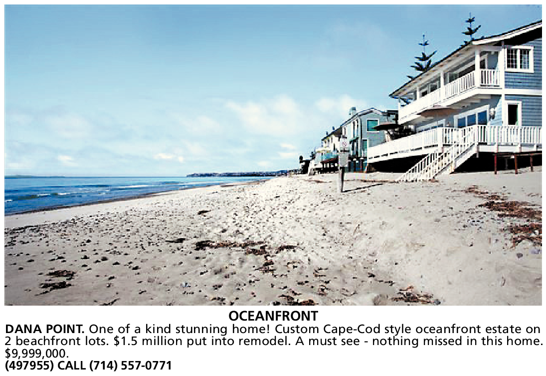 OCEANFRONT DANA POINT. One of a kind stunning home! Custom Cape-Cod style oceanfront estate on 2 beachfront lots. $1.5 million put into remodel. A must see - nothing missed in this home. $9,999,000. (497955) CALL (714) 557-0771