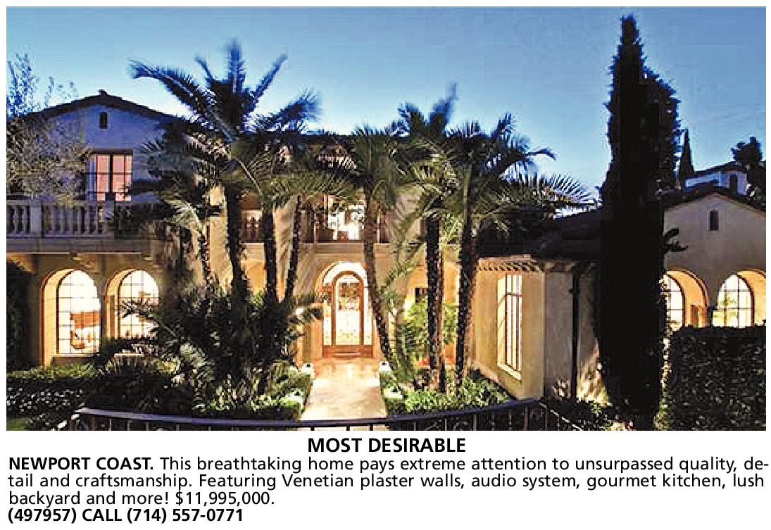 MOST DESIRABLE NEWPORT COAST. This breathtaking home pays extreme attention to unsurpassed quality, detail and craftsmanship. Featuring Venetian plaster walls, audio system, gourmet kitchen, lush backyard and more! $11,995,000. (497957) CALL (714) 557-0771