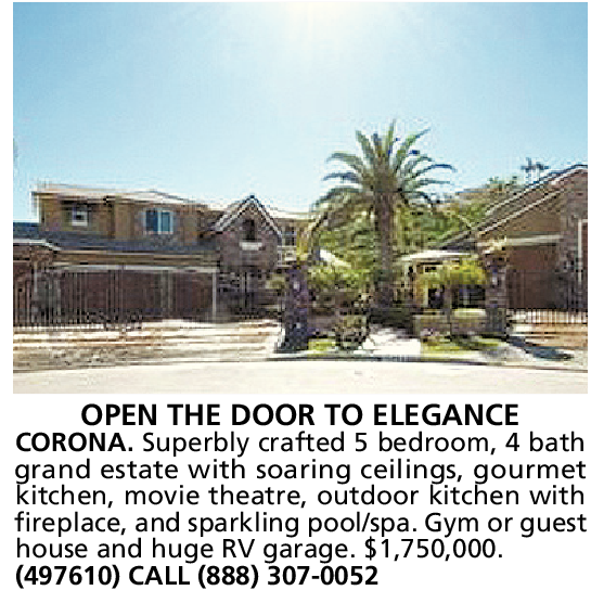 OPEN THE DOOR TO ELEGANCE CORONA. Superbly crafted 5 bedroom, 4 bath grand estate with soaring ceilings, gourmet kitchen, movie theatre, outdoor kitchen with fireplace, and sparkling pool/spa. Gym or guest house and huge RV garage. $1,750,000. (497610) CALL (888) 307-0052