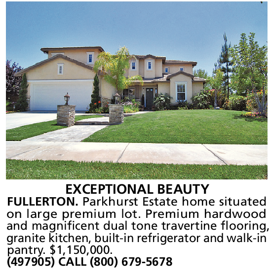 EXCEPTIONAL BEAUTY FULLERTON. Parkhurst Estate home situated on large premium lot. Premium hardwood and magnificent dual tone travertine flooring, granite kitchen, built-in refrigerator and walk-in pantry. $1,150,000. (497905) CALL (800) 679-5678