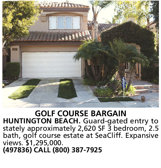 GOLF COURSE BARGAIN HUNTINGTON BEACH. Guard-gated entry to stately approximately 2,620 SF 3 bedroom, 2.5 bath, golf course estate at SeaCliff. Expansive views. $1,295,000. (497836) CALL (800) 387-7925