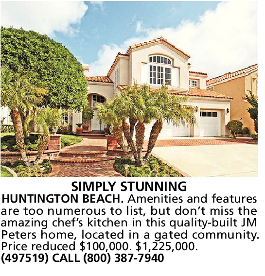 SIMPLY STUNNING HUNTINGTON BEACH. Amenities and features are too numerous to list, but don’t miss the amazing chef’s kitchen in this quality-built JM Peters home, located in a gated community. Price reduced $100,000. $1,225,000. (497519) CALL (800) 387-7940