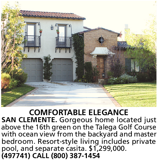COMFORTABLE ELEGANCE SAN CLEMENTE. Gorgeous home located just above the 16th green on the Talega Golf Course with ocean view from the backyard and master bedroom. Resort-style living includes private pool, and separate casita. $1,299,000. (497741) CALL (800) 387-1454