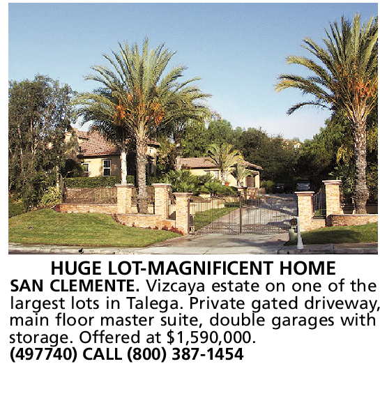 HUGE LOT-MAGNIFICENT HOME SAN CLEMENTE. Vizcaya estate on one of the largest lots in Talega. Private gated driveway, main floor master suite, double garages with storage. Offered at $1,590,000.