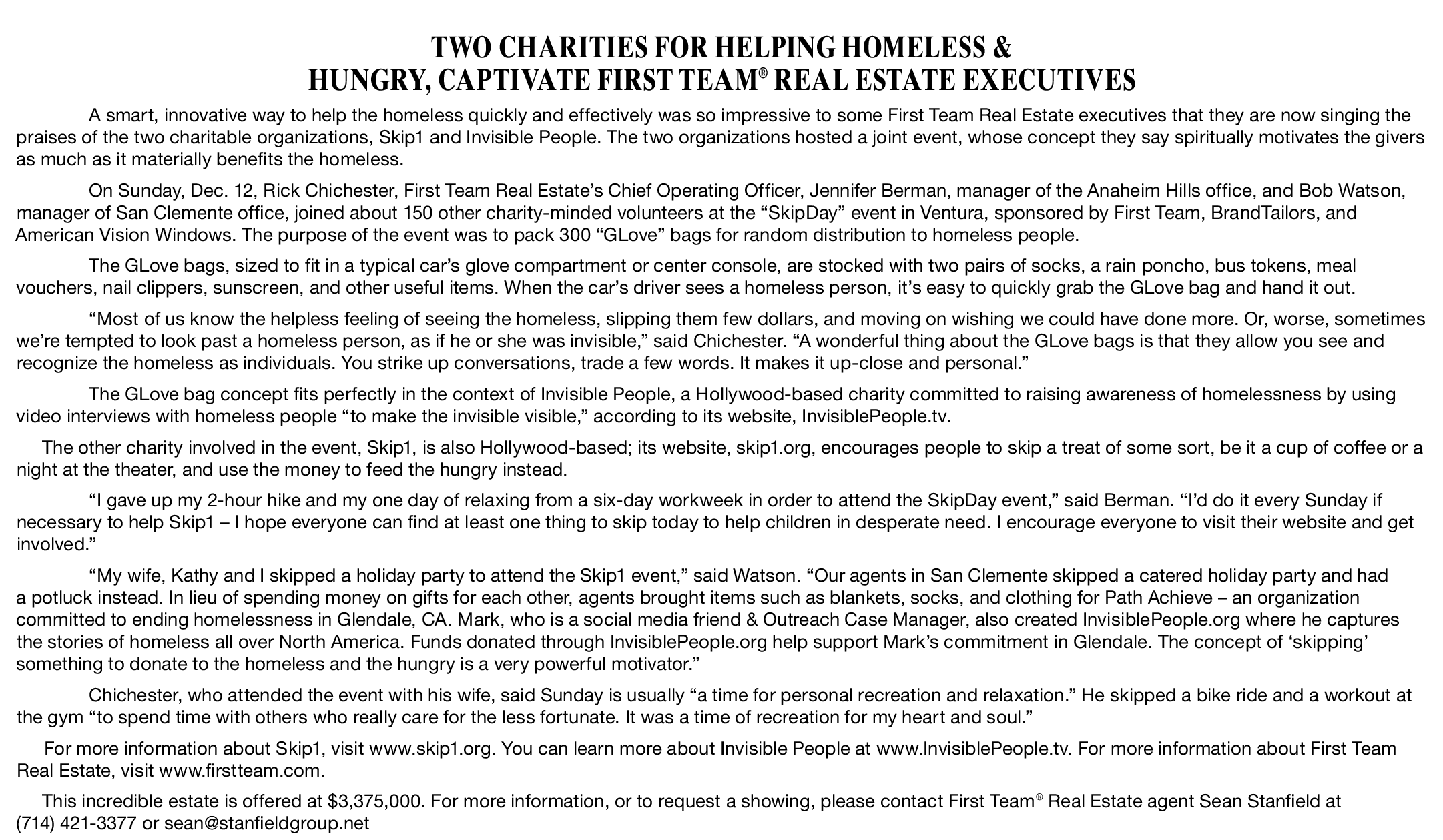 A smart, innovative way to help the homeless quickly and effectively was so impressive to some First Team Real Estate executives that they are now singing the praises of the two charitable organizations, Skip1 and Invisible People. The two organizations hosted a joint event, whose concept they say spiritually motivates the givers as much as it materially benefits the homeless.
