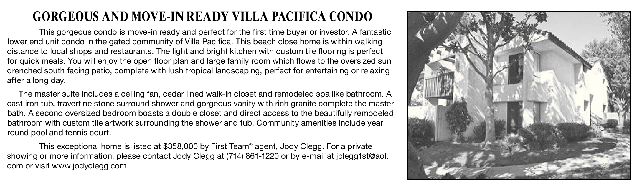 This exceptional home is listed at $358,000 by First Team ® agent, Jody Clegg. For a private showing or more information, please contact Jody Clegg at (714) 861-1220 or by e-mail at jclegg1st@aol. com or visit www.jodyclegg.com.