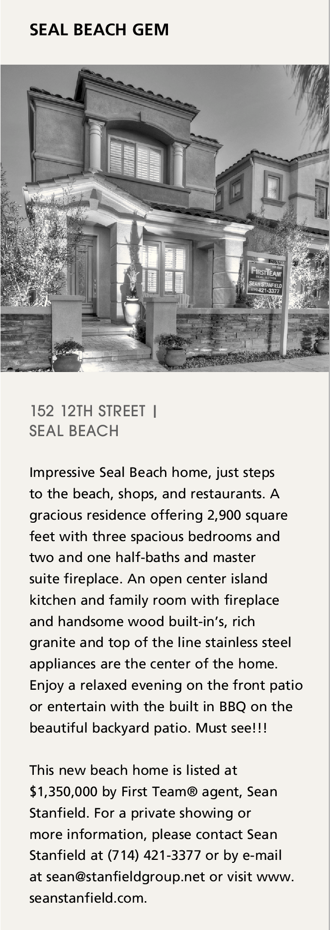 SEAL BEACH GEM 152 12TH STREET | SEAL BEACH Impressive Seal Beach home, just steps to the beach, shops, and restaurants. A gracious residence offering 2,900 square feet with three spacious bedrooms and two and one half-baths and master suite fireplace. An open center island kitchen and family room with fireplace and handsome wood built-in’s, rich granite and top of the line stainless steel appliances are the center of the home. Enjoy a relaxed evening on the front patio or entertain with the built in BBQ on the beautiful backyard patio. Must see!!! This new beach home is listed at $1,350,000 by First Team® agent, Sean Stanfield. For a private showing or more information, please contact Sean Stanfield at (714) 421-3377 or by e-mail at sean@stanfieldgroup.net or visit www. seanstanfield.com.