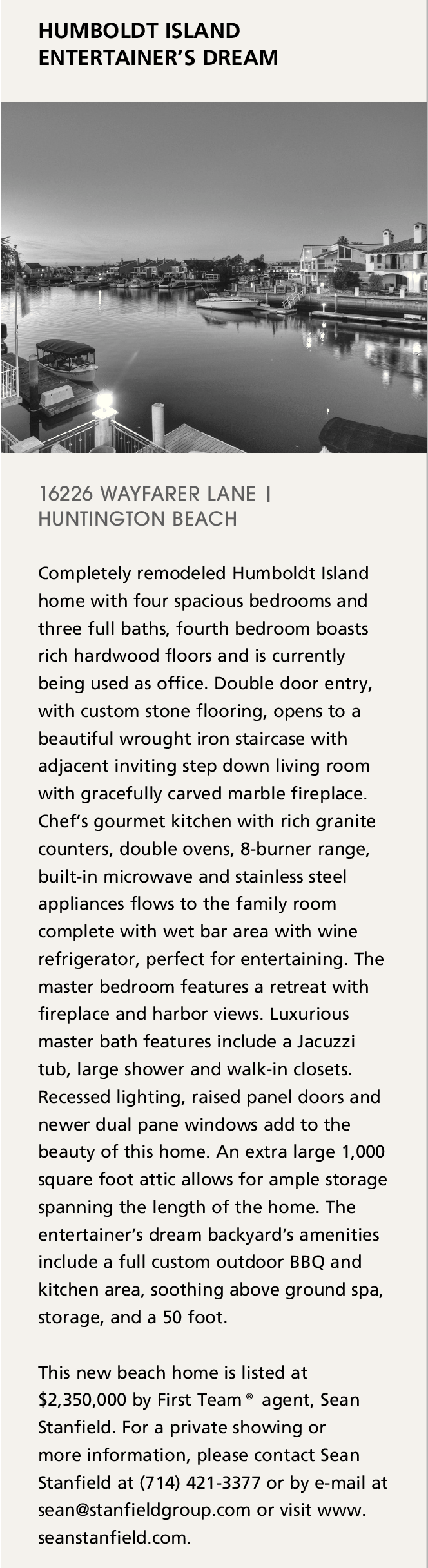 This new beach home is listed at $2,350,000 by First Team® agent, Sean Stanfield. For a private showing or more information, please contact Sean Stanfield at (714) 421-3377 or by e-mail at sean@stanfieldgroup.com or visit www. seanstanfield.com.