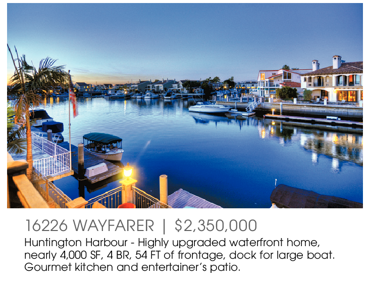 16226 WAYFARER | $2,350,000 Huntington Harbour - Highly upgraded waterfront home, nearly 4,000 SF, 4 BR, 54 FT of frontage, dock for large boat. Gourmet kitchen and entertainer’s patio.