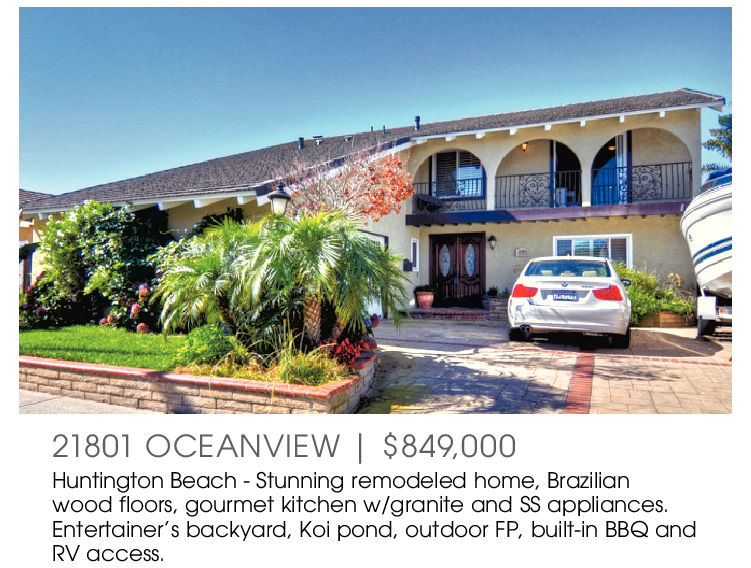 21801 OCEANVIEW | $849,000 Huntington Beach - Stunning remodeled home, Brazilian wood floors, gourmet kitchen w/granite and SS appliances. Entertainer’s backyard, Koi pond, outdoor FP, built-in BBQ and RV access.